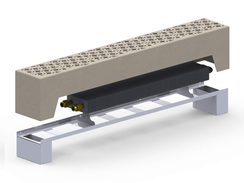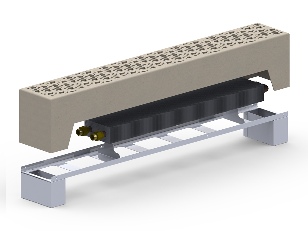 Всі підлогові радіатори водяного опалення ТМ Carrera складаються зі сталевої основи, на який кріпиться мідно-алюмінієвий теплообмінник, кожуха і декоративної закриває решітки. Кожух конвектора, а також решітка можуть бути виконані в будь-якому кольорі палітри RAL, що дозволяє зробити підлоговий конвектор частиною інтер'єру. До того ж, підлогові системи опалення мають низьку тепловою напруженістю і дозволяють розміщувати елементи декору та меблі безпосередньо біля самого конвектора.