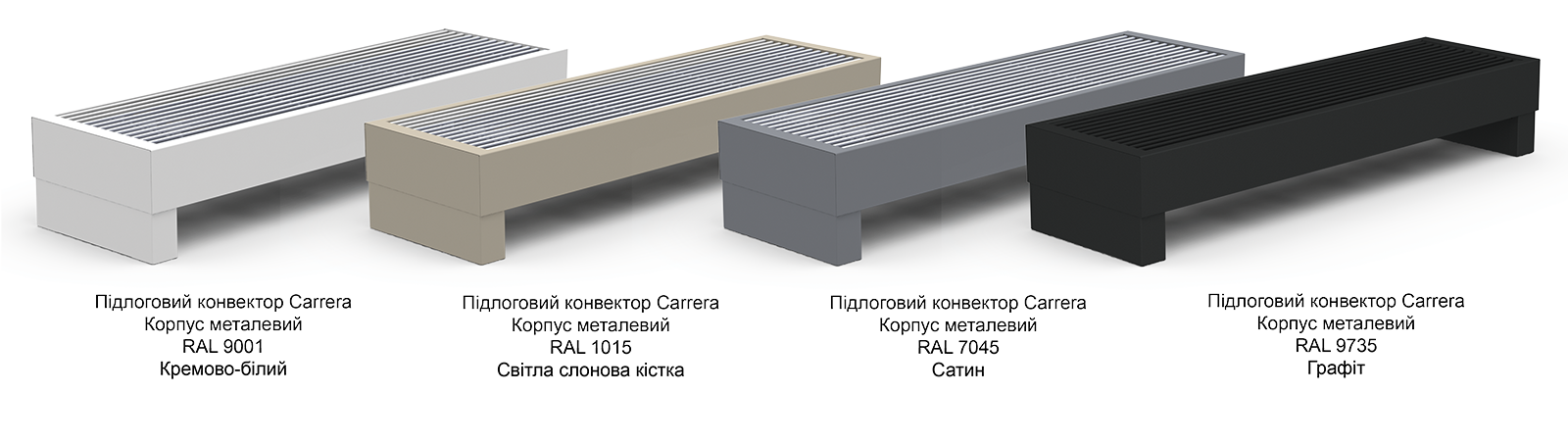 Підлогові конвектори Carrera Electro – це ідеальне рішення для опалення приміщень з вітражним склінням або в приміщеннях з низькими підвіконнями, без підключення його до централізованої системи опалення. Конвектора використовуються для створення бар’єру від проникнення холодного повітря в приміщення, як основне джерело тепла, а так само підкреслити дизайн, і оптимізувати простір. Корпус виконаний з високоякісної сталі товщиною 1 мм пофарбований зносостійким порошковим покриттям, з можливістю фарбування корпусу в колір палітри RAL.